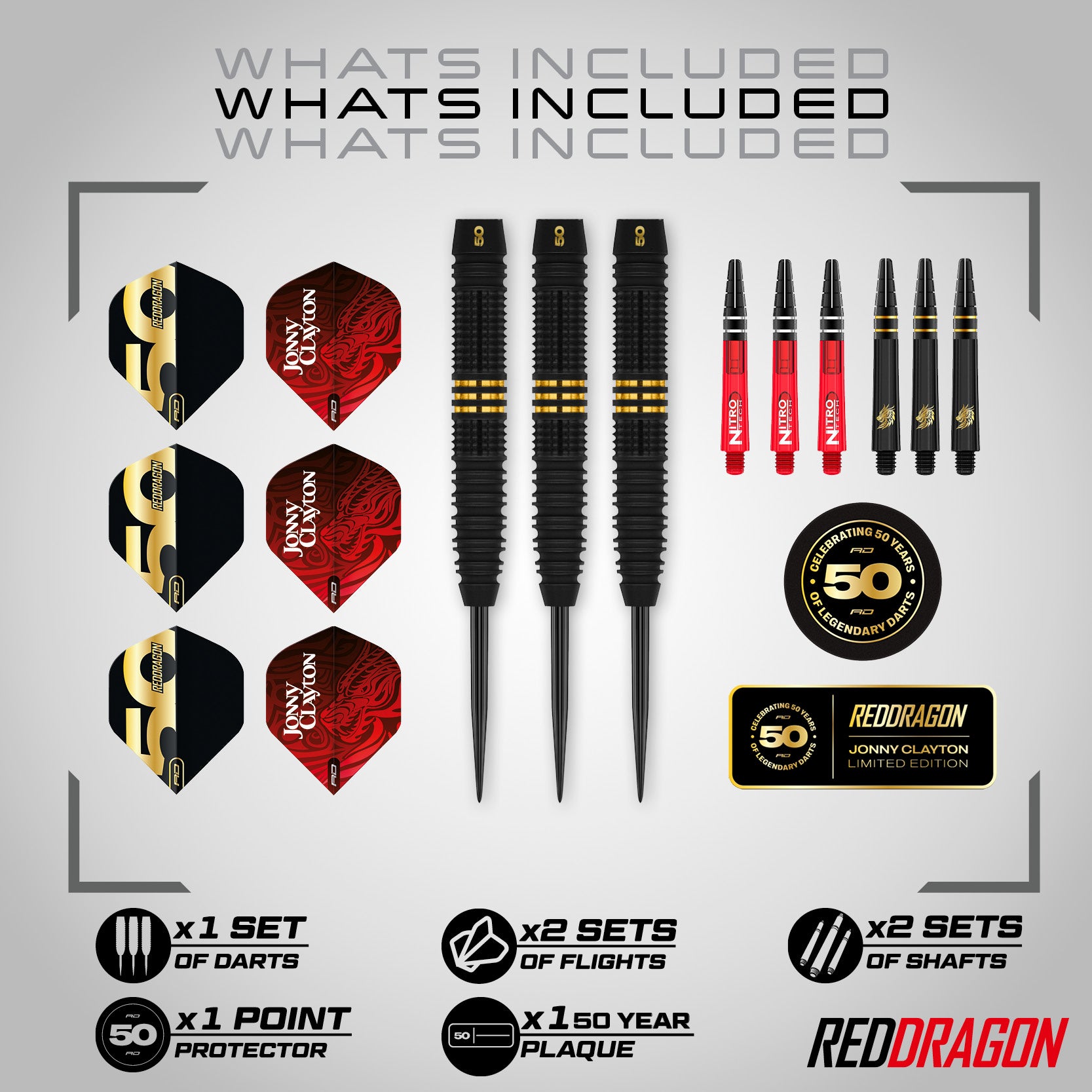 Presented in a collectors’ 50-Year presentation box, this set includes limited-edition gold-trimmed stems, signature flights, and a commemorative plaque — celebrating five decades of Red Dragon craftsmanship.